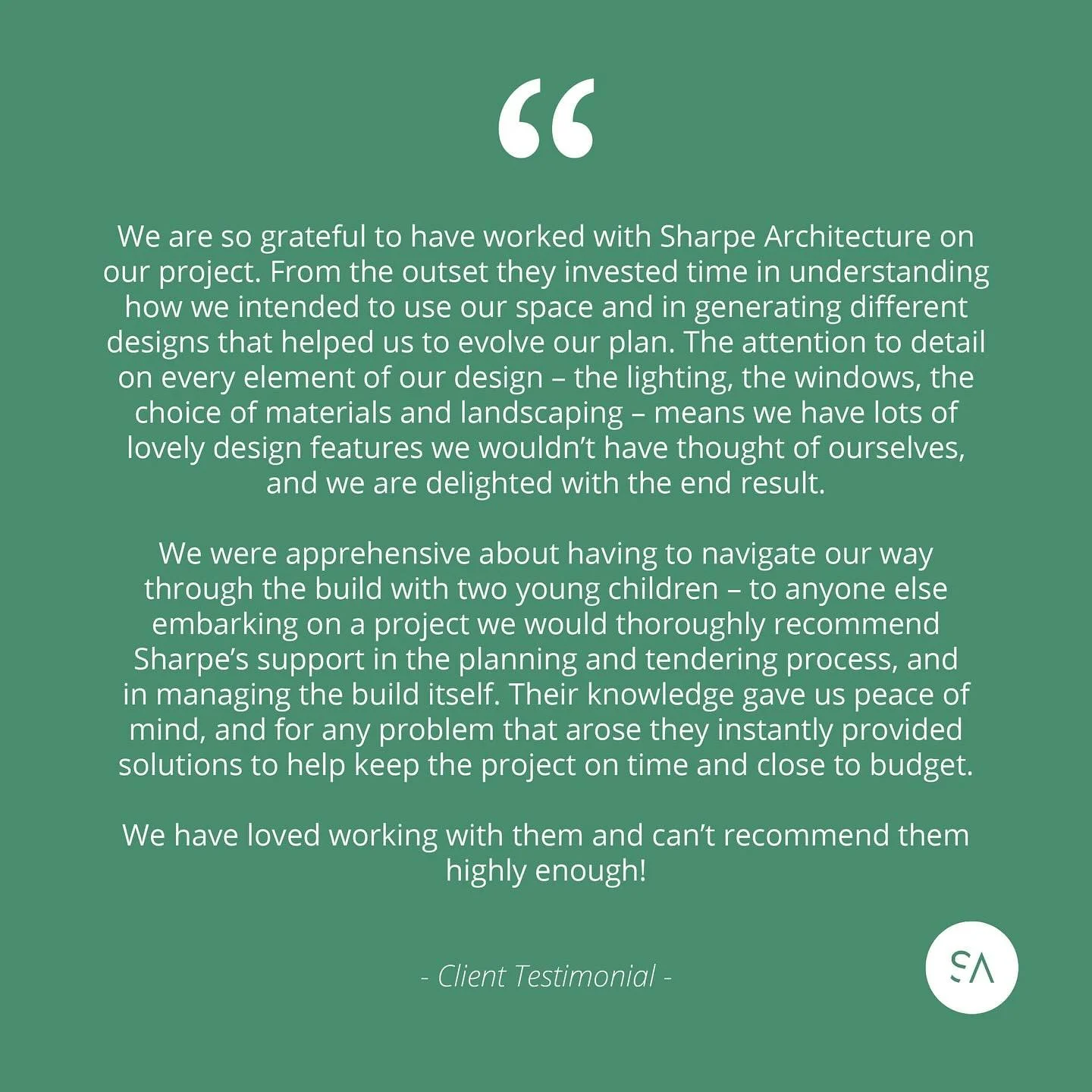 • “Sharpe Architecture were fantastic throughout. From inception to delivery, Frances and Simon helped us to realise what we set out to with the project, and they were always on hand to offer their advice and support.”