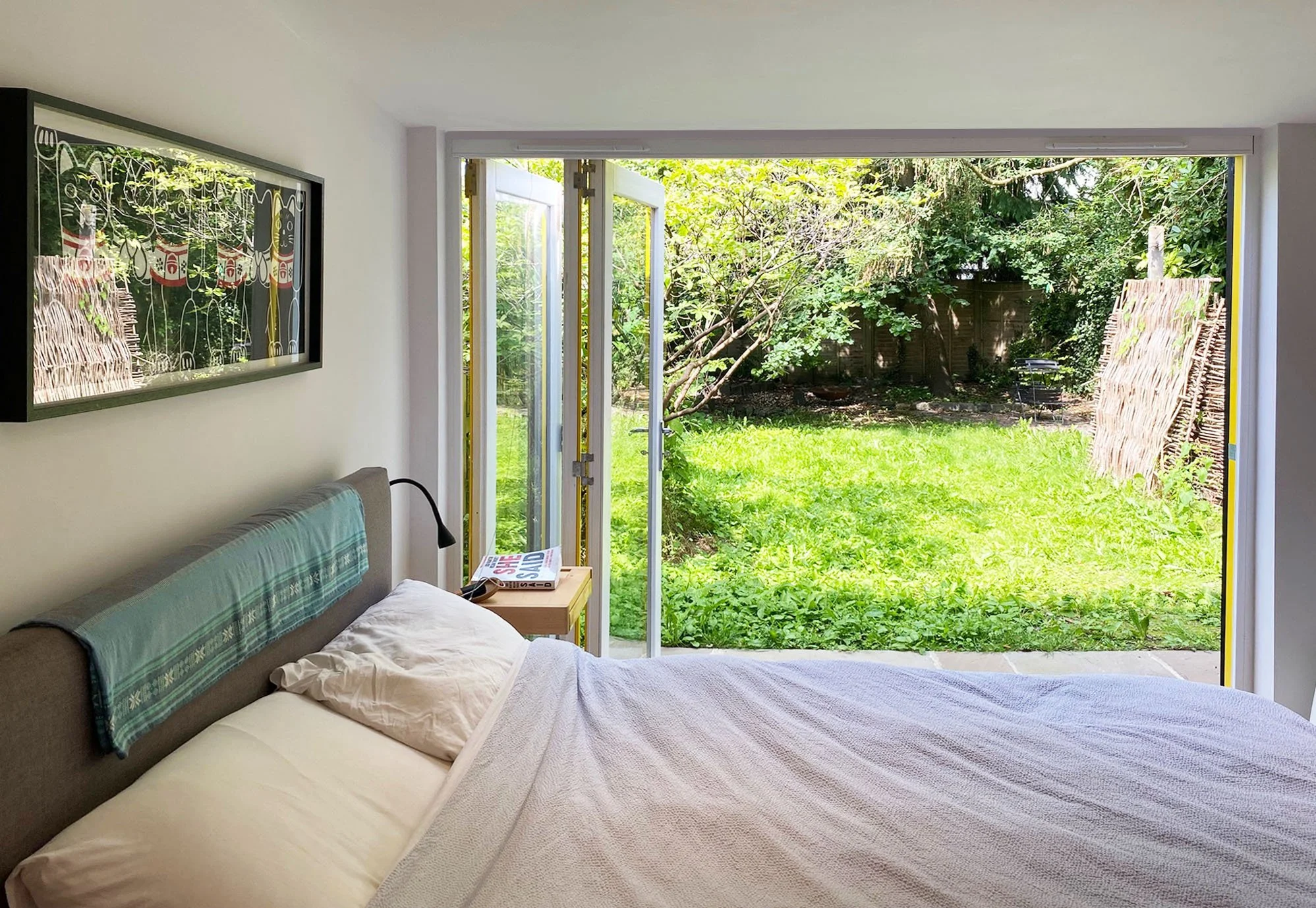 We used a timber frame to keep the build cost-effective, light, and efficient, and wrapped the form in batten cladding to give the extension a dynamic shape while still respecting neighbouring rights to light. Yellow bi-fold doors add a playful touch and open directly onto the garden, making the new room feel both connected and accessible.