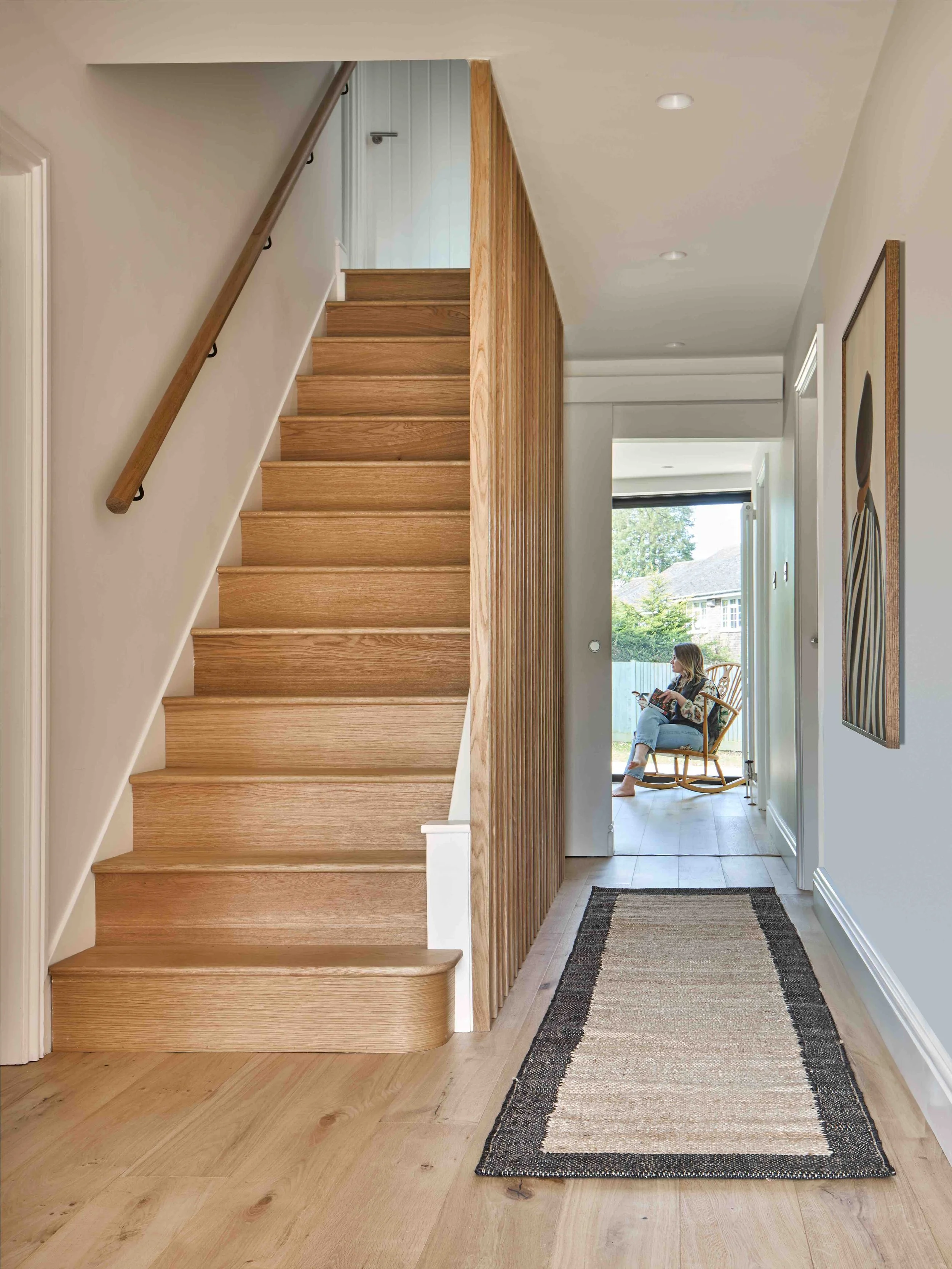 Internally, we re-clad the original 1980s staircase in oak and added a slatted oak balustrade to give it a clean, contemporary feel.