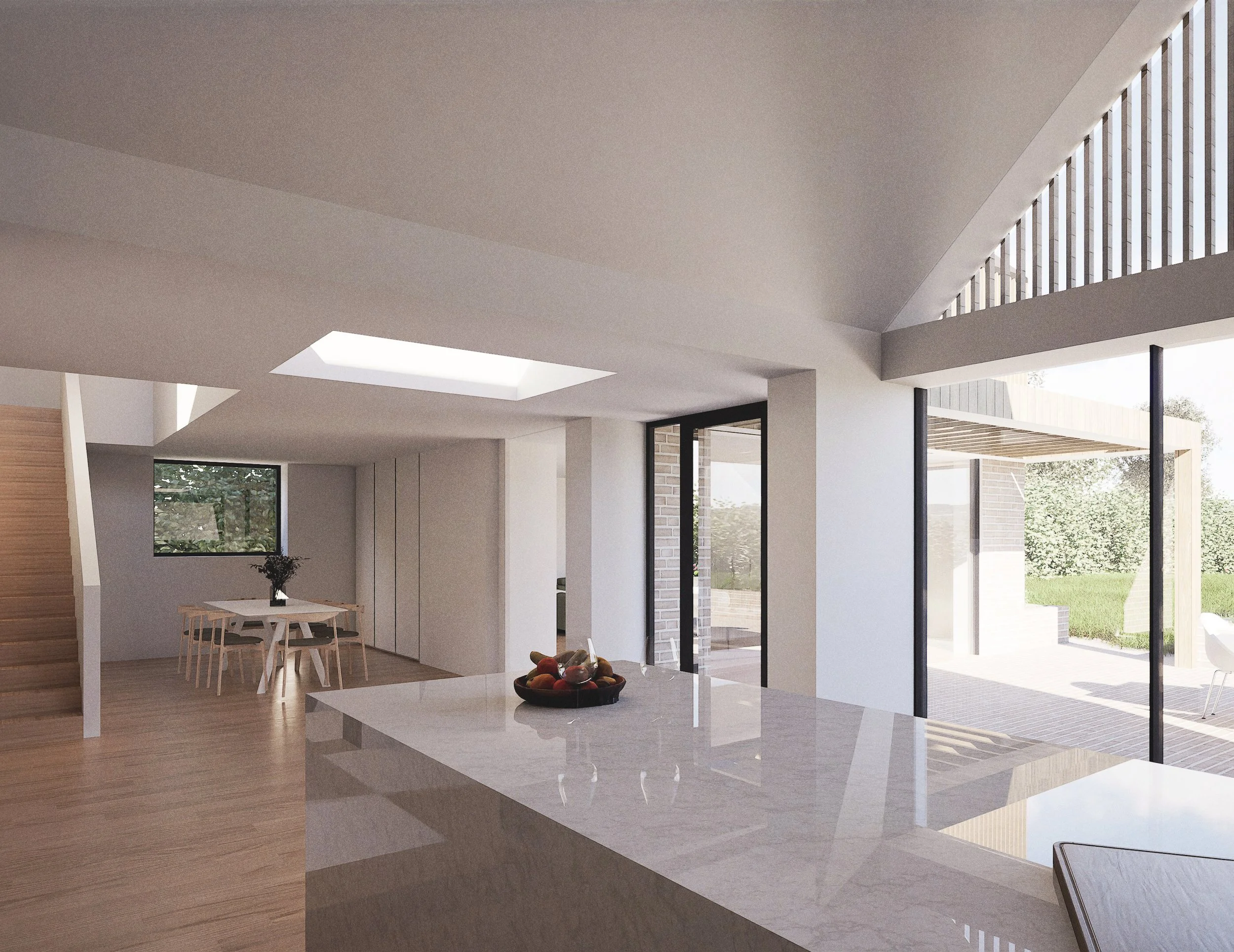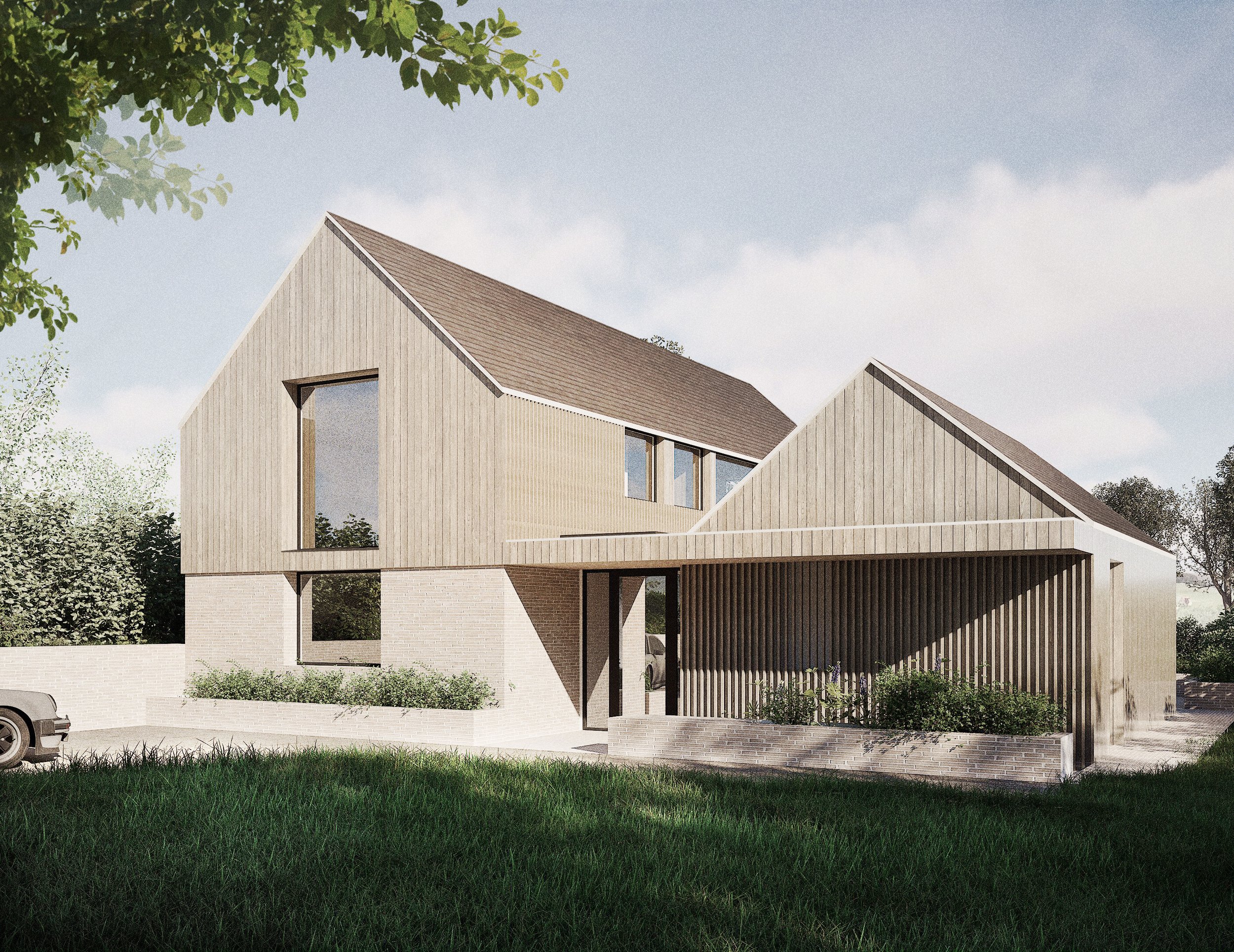 The clients wanted a modern family home that made better use of their generous site. The existing house was poorly arranged, outdated, and tightly positioned against the eastern boundary. With compromised headroom, inadequate insulation, and a series of low-quality outbuildings scattered across the garden, the site had far more potential than the original dwelling could offer.