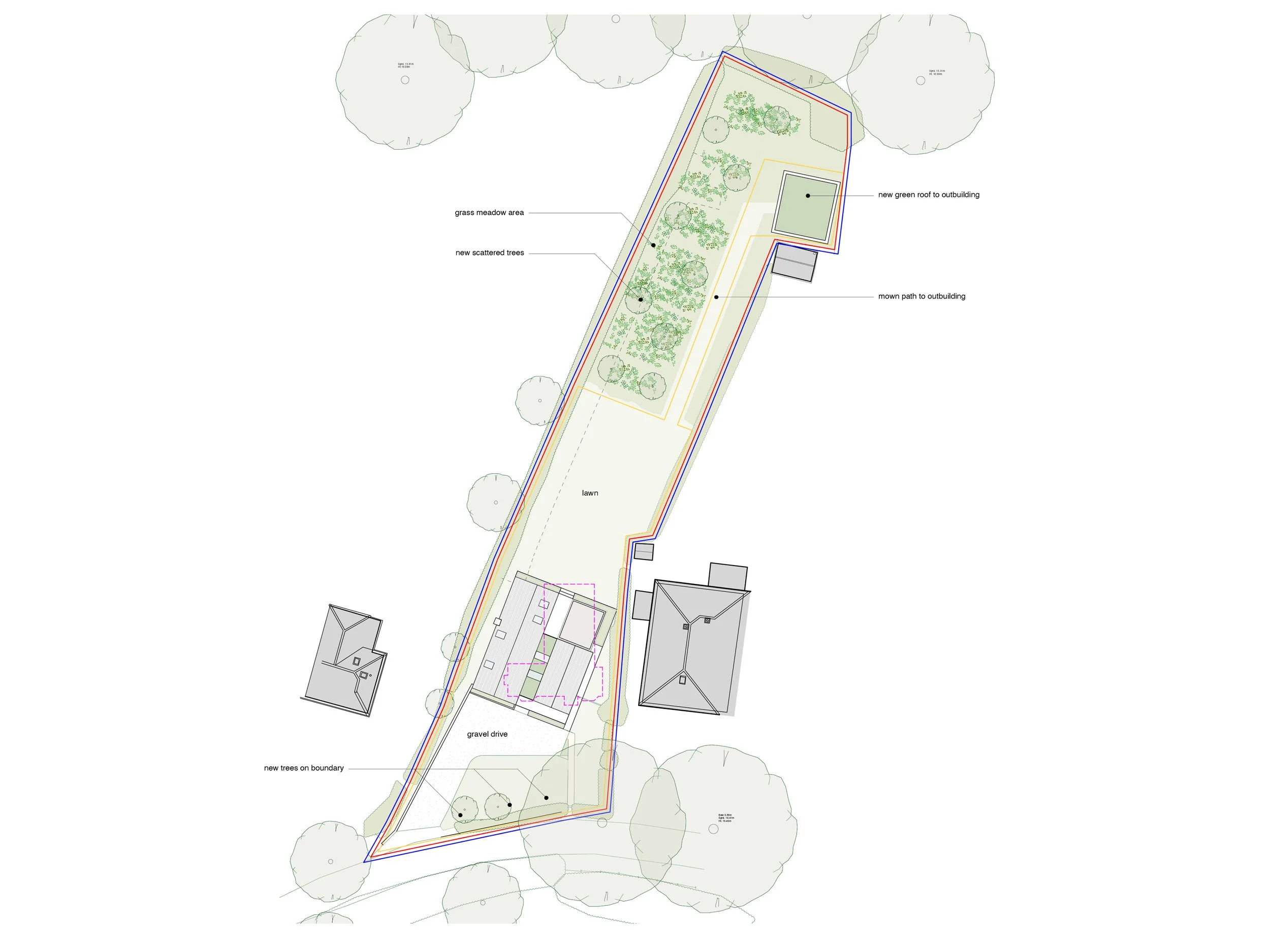 A major part of the scheme is the landscape strategy. Removing the concrete driveway and scattered outbuildings allows the rear garden to be transformed into a meadow with mown paths, new trees and ecological enhancements. This approach improves biodiversity and strengthens the site’s relationship with its rural setting.