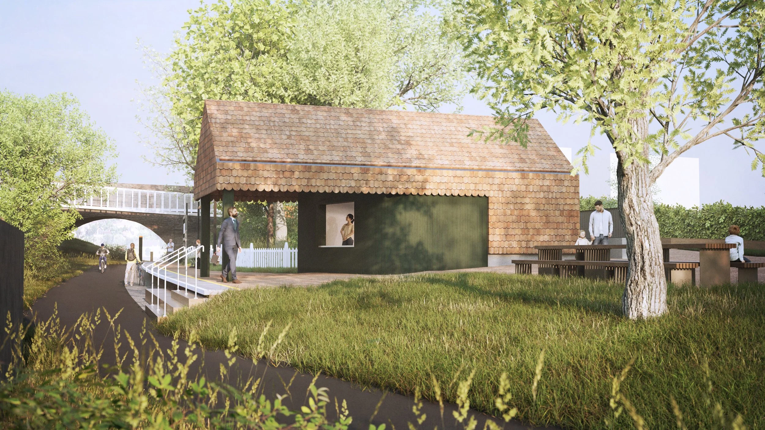 The kiosk’s design evolved into a modern reinterpretation of the former railway shelter that once occupied the site. The original structure was defined by its large overhanging canopy, pitched roof, and decorative fretwork. In response, we refined and simplified the building’s form, preserving the most characterful elements of its history. Scalloped shingles were chosen to evoke the ornamental mouldings traditionally found in railway architecture.