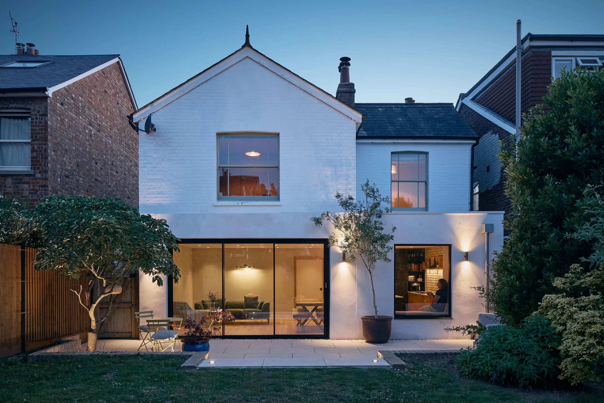 The owners of this charming, double-fronted cottage wanted to remedy their awkward ground-floor layout. A previous extension had created a large living area, but at the cost of making the kitchen feel narrow, dark and disconnected. The existing conservatory aggravated the problem — it overheated in summer and became chilly in winter, making it an unreliable social space. The brief was to create a fluid, spacious family area that would combine kitchen, dining, and informal living, all while keeping sustainability front of mind and future-proofing for climate change.