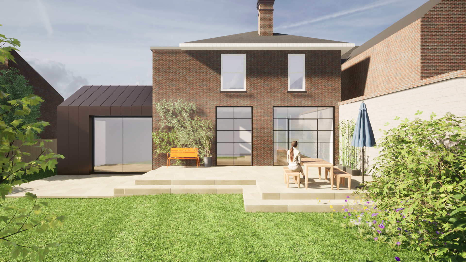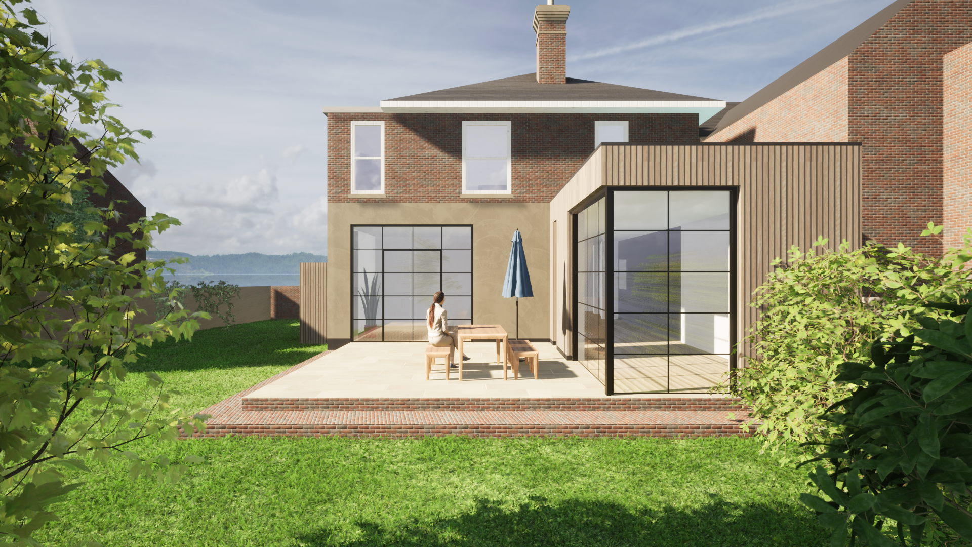 We looked at several options for extending and reconfiguring the house including a rear extension versus a side extension (see above). Key to the design at the rear was rebalancing the elevation . One of the rooms that worked well was the kitchen/diner which already had a large area of crittall-style glazing recently installed. We decided to echo this throughout the ground floor whilst using complimentary glazing and cladding for the extension to preserve the integrity of the existing historic building.