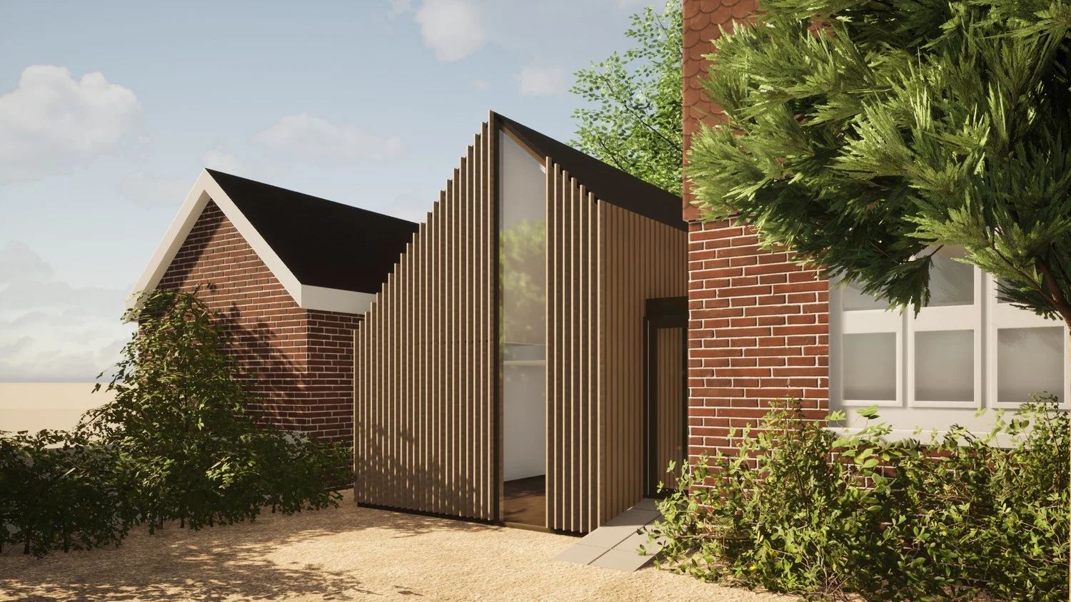In the spirit of the Arts and Crafts values we started looking at contemporary building forms designs to compliment the historic main house, with a strong handcrafted carpentry element to the timber work. We developed the designs and explored various options for textures and cladding patterns in 3D. The final design had a hidden door concealed within the cladding.